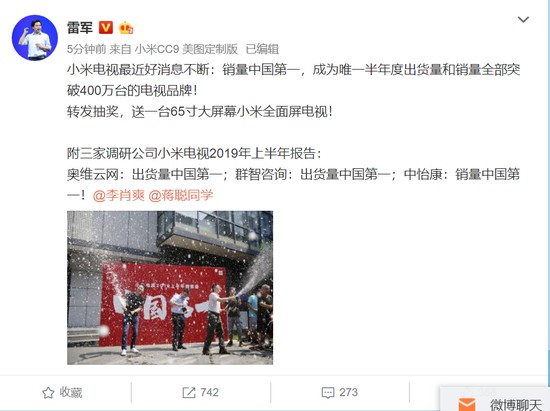 炣燃科技7月24日讯 今日,雷军在个人微博宣布,小米电视2019年上半年销量中国第一,成为唯一半年度出货量和销量全部突破400万台的电视品牌。