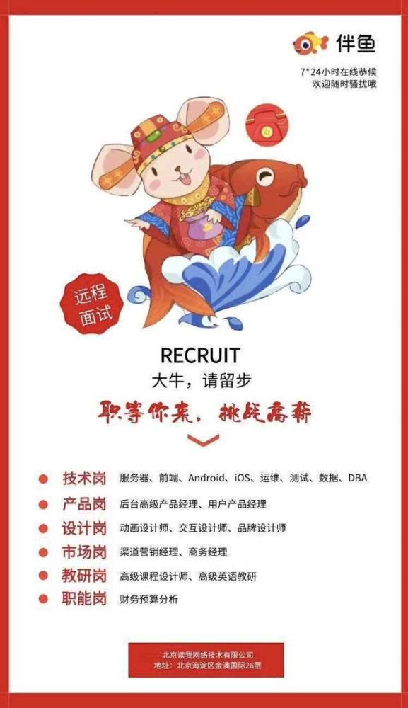 黄河说,“我们和一些教育机构不太一样,我们是多业务线多产品并行,覆盖了不同年龄段孩子的不同的需求,所以需要的人才也是远远不够的。“截止目前,伴鱼的技术、产品、设计、市场、教研、职能、销售、班主任等部门均在招纳人才中,待招岗位至少有上百人。
