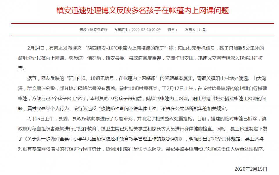 对于已经暴露出来的问题,各地政府也在尝试解决。比如,上文提到的陕西学生遇到没有网络信号的问题,镇安县政府发布通告称,将摸排统计没有覆盖网络信号的村组。而且,为了解决农村和偏远地区孩子“没网上课”的问题,不久前,教育部基础教育司司长吕玉刚对外表示,从2月17日开始,中国教育台4频道开设网课。长安大学则为学校中3055名特困生的银行卡里偷偷充值,每人100元,作为流量补助。