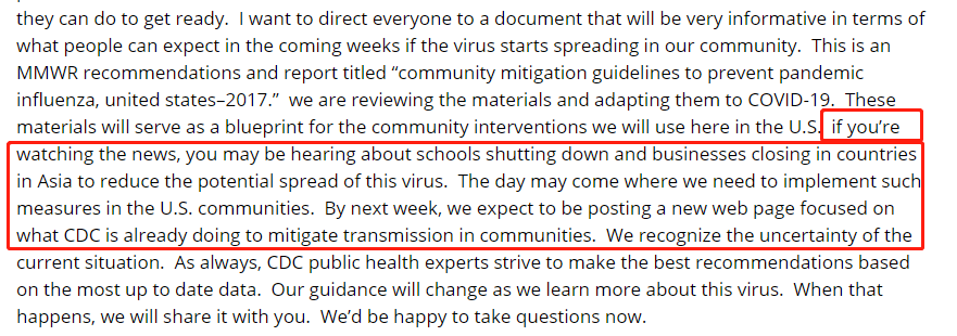 而美国疾控中心更是在简报中表示,不排除未来某一天美国将会效仿亚洲国家,暂时关闭工厂和学校。