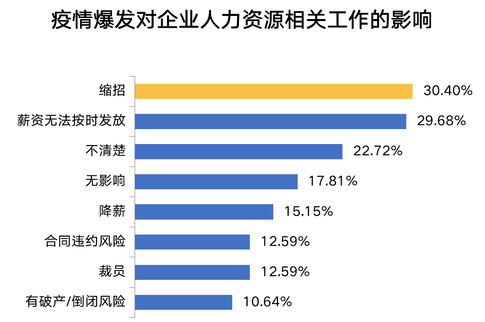 疫情之下,保证现金流成为企业的第一要务,停止招聘则成为老板们的第一步。这也反映在数据上,根据智联招聘的调查,30.4%的企业表示将会减员缩编,还有29.68%无法为员工按时发放薪资,无影响的企业仅占17.81%。另外,惨淡经营下,降薪、合同违约风险、裁员也成为企业不得不面对的问题,10.64%的受访企业面临着破产或倒闭的风险。