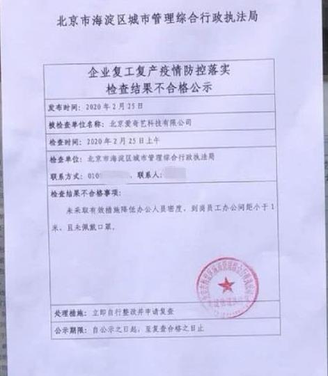 原创内容 传爱奇艺复工防疫检查不合格 员工办公间距小于1米且未戴口罩 2020-02-26 09:22:25 分享 炣燃科技2月26日讯(江丞华) 2月25日,有爱奇艺员工爆料称,爱奇艺公司收到了北京海淀城管部门的《企业复工复产疫情防控落实检查结果不合格公示》通知。据网传通知的截图显示,上述公示发布时间为2月25日,检查结果不合格事项为:未采取有效措施降低办公人员密度,到岗员工办公间距小于1米,且未佩戴口罩。处理措施为:立即自行整改并申请复查。截至《炣燃科技》发稿时,爱奇艺方面尚未对此发表回应。