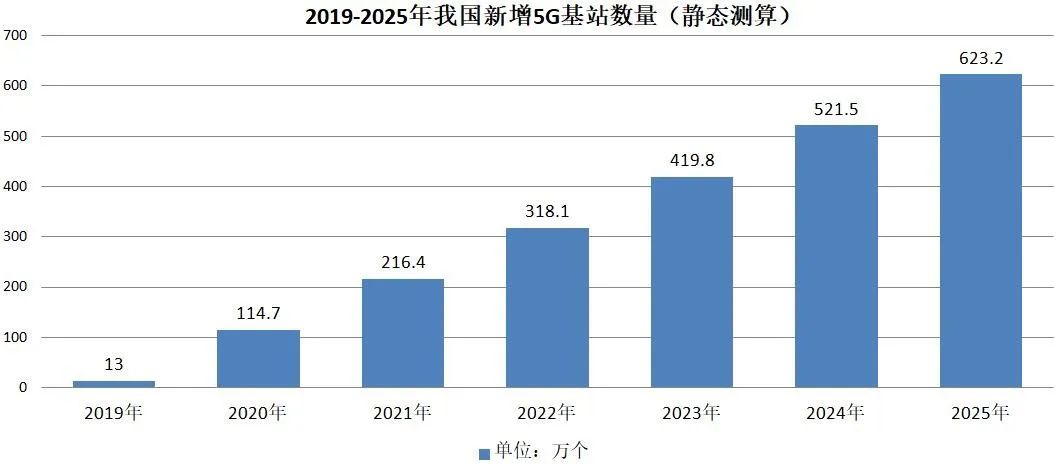 2019年,全国已经建成约13万个5G基站,以7年建设623万个为目标,则能测算出每年5G基站数量。