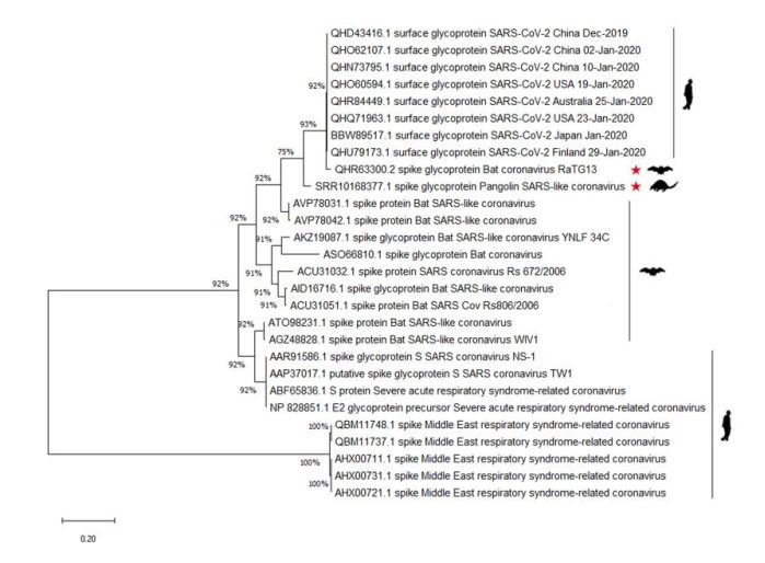 刺突RBD受体相互作用是决定冠状病毒宿主范围的关键因素。研究组对来自SARS-CoV、蝙蝠或穿山甲SARS样CoV和SARS-CoV-2的刺突蛋白的RBD序列进行了比对。