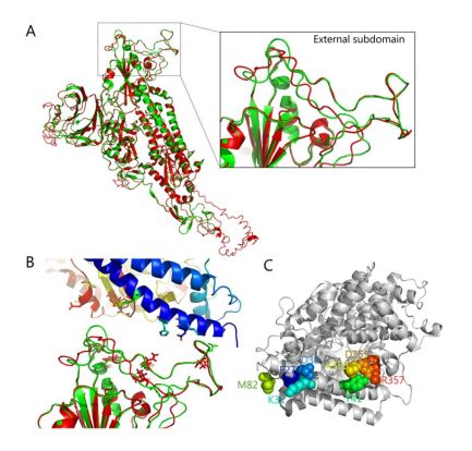 类似SARS-CoV与人ACE2的结合,受体上的31、41、82、353、355和357位残基在与SARS CoV-2刺突蛋白相互作用时会定位到表面。