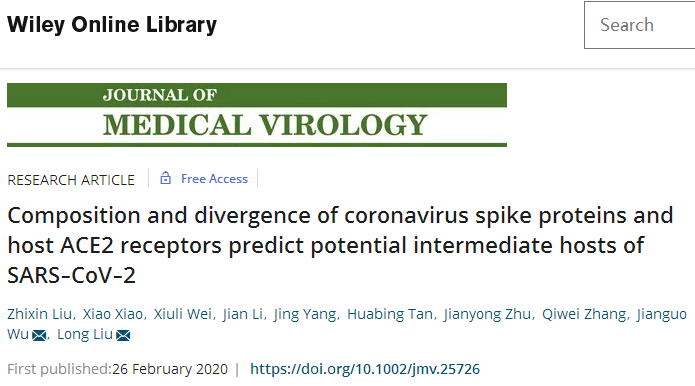 2月26日,湖北医药学院附属人民医院的刘龙联合广州暨南大学吴建国课题组在《医学病毒学杂志》上发表论文称,龟类(西部锦龟、绿海龟、中华鳖)也可能是将新冠病毒传播给人类的潜在中间宿主。