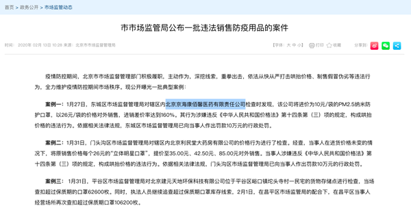 《炣燃科技》注意到,2月13日,北京市市场监督管理局曾公布一批违法销售防疫用品的案件。