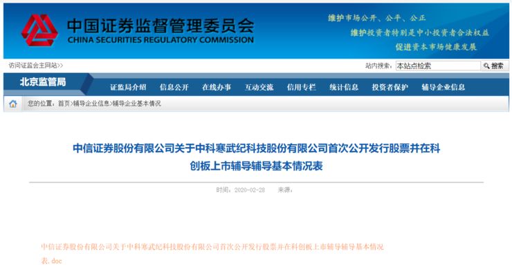 炣燃科技2月29日综合雷锋网消息,北京证监会网站2月28日晚间披露,中信证券与中科寒武纪科技股份有限公司(简称“寒武纪”)在2019年12月5日签署辅导协议,后者计划在科创板上市。