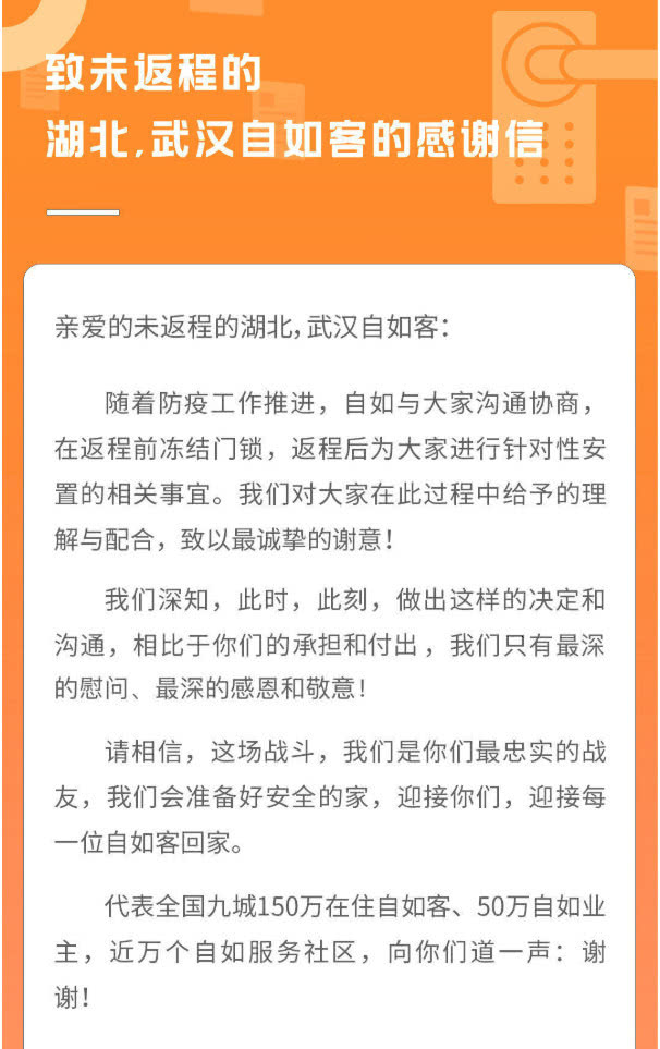 今天(2月29日)上午,微博认证为“北京自如生活企业管理有限公司”的微博用户@自如客服,与微博认证为“自如CEO”的微博用户@自如熊林 均在微博上发布了“致未返程的湖北、武汉自如客的感谢信”,信中表示,“随着防疫工作推进,自如与大家沟通协商,在返程前冻结门锁,返程后为大家针对性安置的相关事宜,对大家的理解和配合致以谢意。”