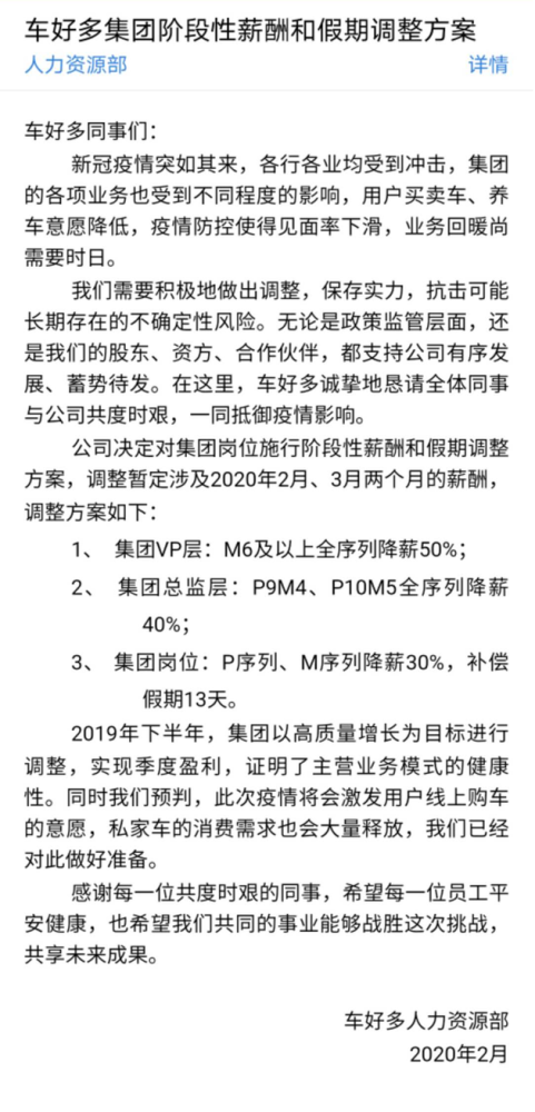 2月28日,瓜子二手车母公司车好多集团发内部信称,决定对集团岗位施行阶段性薪酬和假期调整方案,调整暂定涉及2020年2月、3月两个月的薪酬,集团VP层:M6及以上全序列降薪50%;集团总监层:P9M4、P10M5全序列降薪40%集团岗位:P序列、M序列降薪30%,补偿假期13天。
