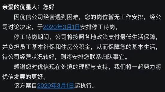 3月1日,有消息称,优信(UXIN.N)给部分员工发通知称,因公司经营遇到困难,岗位暂无工作安排,于3月1日安排停工待岗。停工待岗期间,将按照各地政策支付最低生活保障,并负担员工基本社保和住房公积金,从而保障员工基本生活,待公司经营状况转好,再安排复岗事宜。