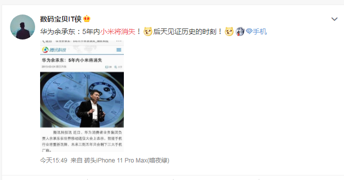 不过,上述解读并非媒体单纯的臆测。谈到小米,彼时的余承东表示:“很多手机厂商看起来非常成功,但它们将很快消失。从长远来看,我认为它们无法生存。”