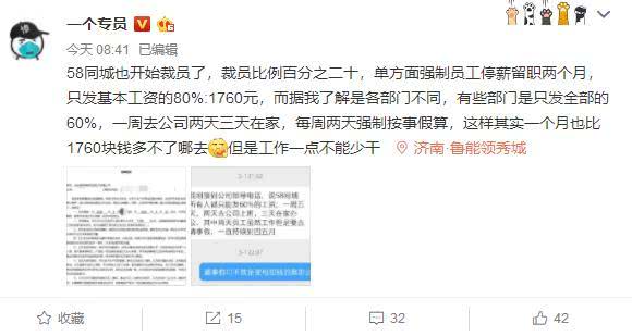 这个爆料称,“58同城也开始裁员了,裁员比例百分之二十,单方面强制员工停薪留职两个月,只发基本工资的80%:1760元,而据我了解是各部门不同,有些部门是只发全部的60%,一周去公司两天三天在家,每周两天强制按事假算,这样其实一个月也比1760块钱多不了哪去,但是工作一点不能少干。”