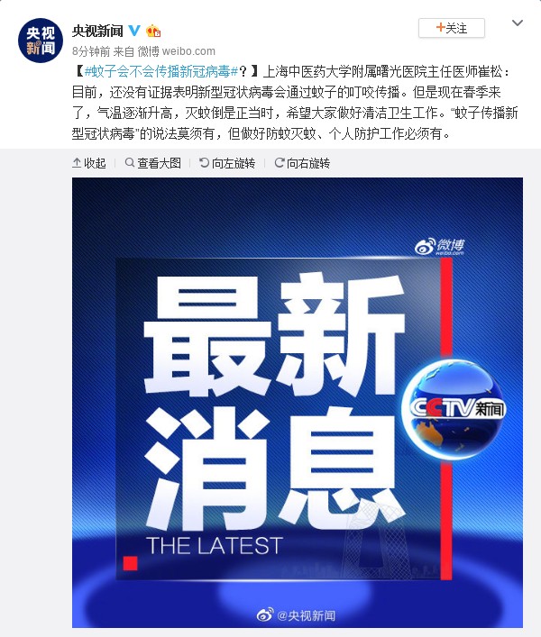 科创 专家解读:“蚊子传播新型冠状病毒”的说法莫须有 2020-03-04 18:20:33 分享 原标题:蚊子会不会传播新冠病毒?上海中医药大学附属曙光医院主任医师崔松:目前,还没有证据表明新型冠状病毒会通过蚊子的叮咬传播。但是现在春季来了,气温逐渐升高,灭蚊倒是正当时,希望大家做好清洁卫生工作。“蚊子传播新型冠状病毒”的说法莫须有,但做好防蚊灭蚊、个人防护工作必须有。