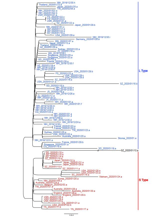 在这103个病毒株中,有101个属于两个亚型之一。具体而言,两个亚型的区别在于病毒RNA基因组的第28144位点,L型是T碱基(对应亮氨酸,Leu),S型是C碱基(对应丝氨酸,Ser)。通过与其他冠状病毒比较,作者发现S型新冠病毒与蝙蝠来源的冠状病毒在进化树上更接近,从而得出S型相对更古老的结论。