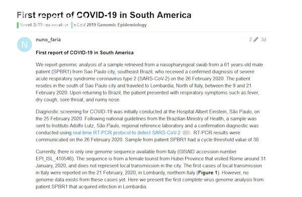 据南方都市报,3月1日,一份发表在病毒学国际交流平台(Virological),题为《First report of COVID-19 in South America》(南美洲首例新型冠状病毒报告)引发关注,这是南美洲首次分析出新冠病毒的基因序列,由巴西Adolfo Lutz国家研究所、国家参考实验室,以及圣保罗大学(USP)、牛津大学热带医学研究所共同完成。