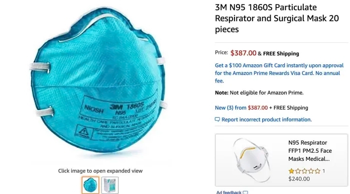 目前,亚马逊平台上仍有许多像那样的商品。例如,有未经授权的经销商出售制造商3M生产的20个盒装口罩,标价为387美元(约合134人民币一个),而正常的零售价约为14.99美元。24瓶的2盎司(约60毫升)普瑞来洗手液(Purell)一盒售价400美元(约合116元人民币一瓶),平常售价则不到10美元。