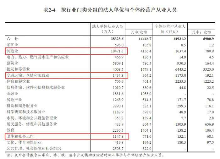 换个方式计算,据《第四次全国经济普查》显示,截至2018年底,中国卫生和社会从业者为1147.8万人,交通运输、仓储和邮政业1434.8万人,制造业10471.3万人。