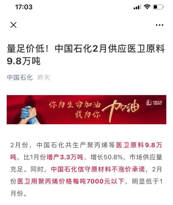 中国石化称生产熔喷布原材料不缺,还降价了。图片来源:中国石化官方公众号截图