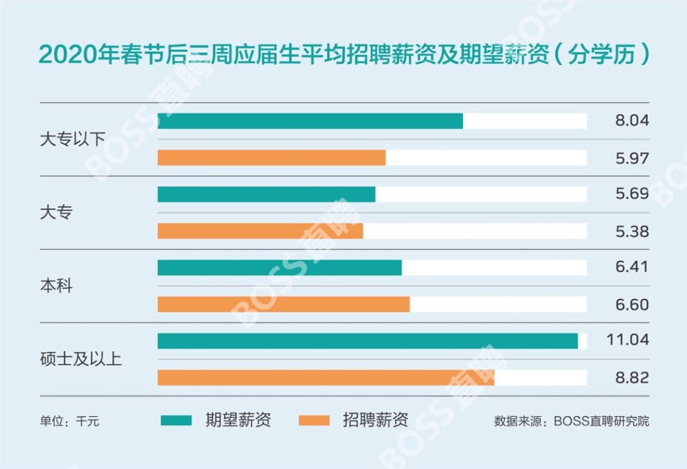 但并非所有应届毕业生都如此。BOSS直聘数据显示,春节后第三周,2020应届生平均期望薪资环比下降4.9%至6480元。其中本科和大专生的期望薪资与招聘薪资已基本接近,而硕士及以上和大专以下应届生的期望薪资依然显著高于招聘薪资。
