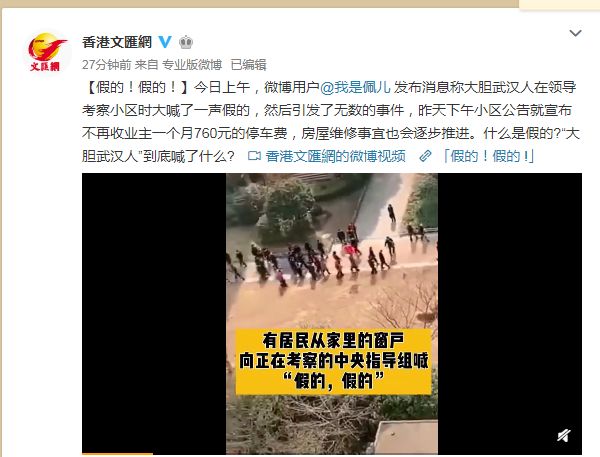 据文汇报说:今日上午,微博用户@我是佩儿发布消息称大胆武汉人在领导考察小区时大喊了一声假的,然后引发了无数的事件,昨天下午小区公告就宣布不再收业主一个月760元的停车费,房屋维修事宜也会逐步推进。