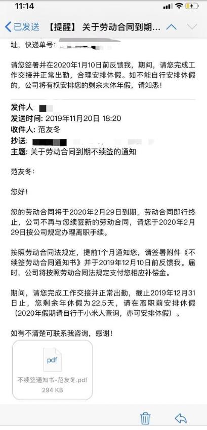 值得关注的是,根据小米在回应文中贴出了邮件截图显示,该公司确实提前三个月就向范友冬发出了不续签合同的通知邮件,并且向员工详细列出了剩余年假天数。
