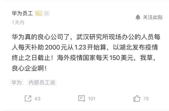 据悉,一份华为内部流传出的《关于新冠肺炎期间对保障客户应急通信及公司业务攻坚作战人员发放临时补助的通知》称,华为深入湖北新冠肺炎医疗救治定点医院和发热门诊等危险区域进行应急通信工程保障的作战人员,每人每天2000元。