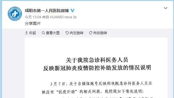 据刊登该反映的自媒体《金口娱言传媒》爆料称,其收到来自陕西省咸阳市第一人民医院急诊科一位医务人员的反映,在他们医院,隔离病区和感控科算“抗疫一线”,每人每天补助300元,发热门诊算“相关人员”每人每天补助200元,而他们急诊科医务人员每天大量接触病人、偶尔进隔离区,却不算“一线人员”也不算“相关人员”,没有“抗疫补助”,只能流血又流泪。