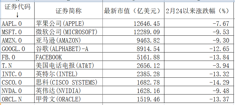 从市值上看,市值最大10只科技类公司两周市值蒸发近5000亿美元。