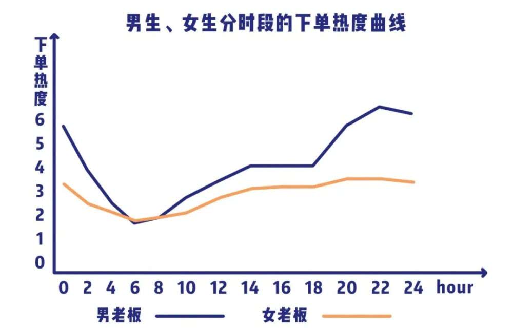 春节期间女性玩家订单全天分布平均,男性用户则普遍在晚上7点以后活跃。