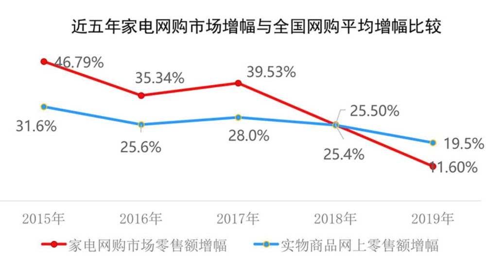 其实中国家电本就面临线上增长乏力的问题。《2019年中国家电市场报告》指出,2019年中国家电网购零售额只增长了1.6%,网购渗透率却达到41.7%,显出疲势。家电销售的一大增长点在线下渠道下沉到县镇和农村,此次疫情却重创线下店,令电商不得不裁撤线下人员。