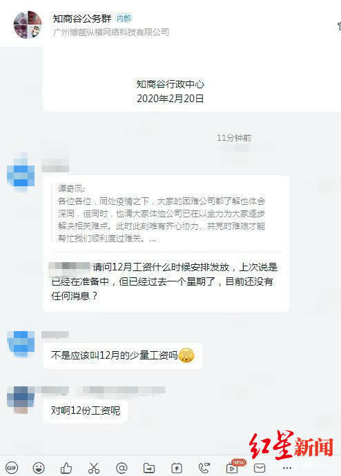 “今年1月才爆发的疫情,跟去年12月的工资有什么关系?”周女士说,2月20日,有员工在公司内部钉钉群上就此事向高层咨询,但却被全员禁言至今。