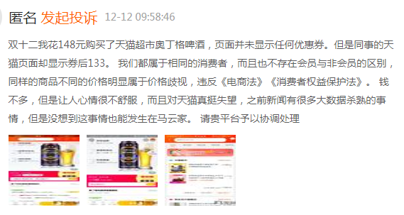 值得注意的是,在黑猫投诉平台上,此前已经有多名自称88VIP会员的投诉者投诉天猫超市称自己无法领取优惠券,结算价格比非会员贵,认为是天猫超市大数据杀熟。微博评论中,部分88VIP会员表示自己开会员的目的就是为了省钱,现在却发现可能还比别人花的钱更多。有会员表示,如果天猫超市不解释清楚这次的“88VIP会员价格”问题,接下来可能不会再续会员。
