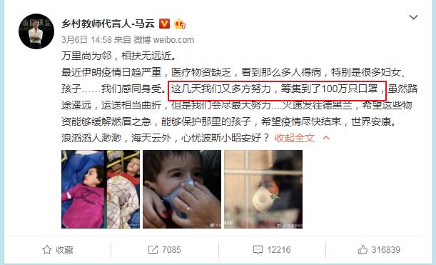 3月6日,马云宣布,其指挥团队筹集到了100万只口罩,转运至疫情严重的伊朗。
