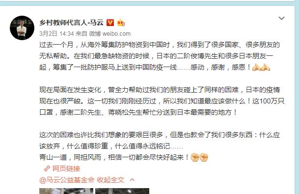 而在此之前的3月2日,马云在微博中透露,过去一个月,由于中国国内疫情严峻,医疗物资匮乏,他和团队从全世界各地不断地筹集防护物资到中国。