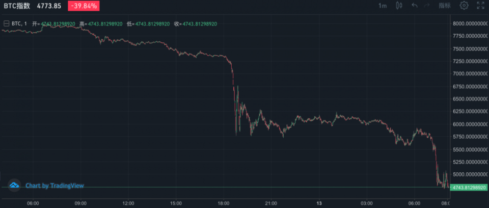 3 月 12 日下午六点半开始,比特币为首的加密货币突然开始大跳水,所有人猝不及防。行情软件的报价不断闪动,比特币价格陆续跌至 6800 美元、6500 美元、6000 美元,在 3 月 13 日晨,更是一路跌破4800美元,并一路击碎所有人的侥幸,有的平台甚至跌到了 4684 美元这个奇妙的数字,也创出了去年 3 月中旬以来,比特币价格的新低。