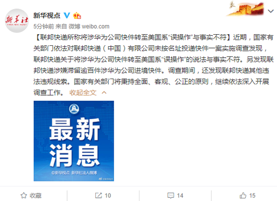商业 调查发现:联邦快递涉华为快件系"误操作"与事实不符 2019-07-26 08:45:42 分享 来源:新华网近期,国家有关部门依法对联邦快递(中国)有限公司未按名址投递快件一案实施调查发现,联邦快递关于将涉华为公司快件转至美国系“误操作”的说法与事实不符。另发现联邦快递涉嫌滞留逾百件涉华为公司进境快件。调查期间,还发现联邦快递其他违法违规线索。国家有关部门将秉持全面、客观、公正的原则,继续依法深入开展调查工作。