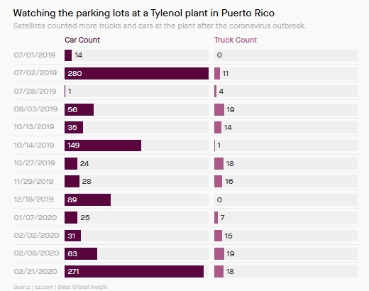 另一种通常需要用来对抗病毒感染的产品是像对乙酰氨基酚这样的退烧药,那也是退烧镇痛药泰诺(Tylenol)的主要成分。Orbital Insight的分析显示,波多黎各的一家泰诺生产商的工厂活动呈现增长。