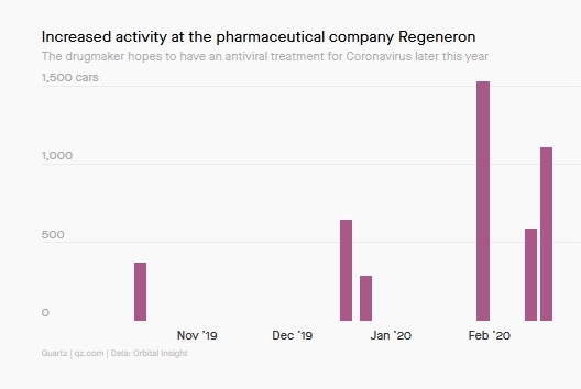 近期美国股市因疫情影响而接连暴跌,而抗病毒药物制造商Regeneron是极个别幸免于难的公司之一。它正在致力于开发新冠病毒的治疗方法。Orbital Insight关于Regeneron的数据并不像它收集的其他数据那样详细,但是它的分析师还是能够发现,Regeneron停车场的车辆数量与去年相比有了很大的增长(见下图)。