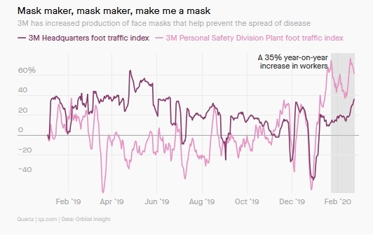 例如,Orbital Insight对美国著名口罩公司3M的活跃度进行了跟踪。除了其它的产品外,该公司还生产用于预防空气传染病的口罩。医院在加强防备,消费者也在寻求自我保护,因此口罩的需求正在迅速飙升。3M曾表示,它正在提高产量。果然,每天在其工厂里追踪员工人流量的传感器证实了这一点: