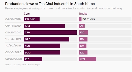 以在韩国大邱生产汽车零部件的韩国公司Tae Chul Industrial为例。据Orbital Insight称,从太空卫星来看,该公司的员工停车场的汽车越来越少,装货区外的卡车则越来越多,这表明生产正在放缓,货物没有被运出。