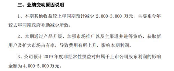 除了上述因素外,三只松鼠曾在此前发布的2019 年度业绩预告中还提到,2019年较2018年同期政府补助减少,预计会导致其他收益较2018年同比减少2000万-3000 万元,是业绩变动的原因之一。
