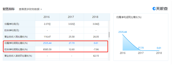 天眼查数据显示,2016年、2017年、2018年三只松鼠归属净利润同比增长分别为2535.44%、27.7%、0.61%。