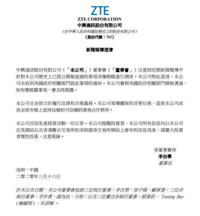 炣燃科技3月17日讯(江丞华) 3月16日晚,针对“行贿遭查”的传言,中兴集团在发布回应中澄清,传言内容为旧闻,该公司涉嫌贿赂被调查一事曾被公开报道。