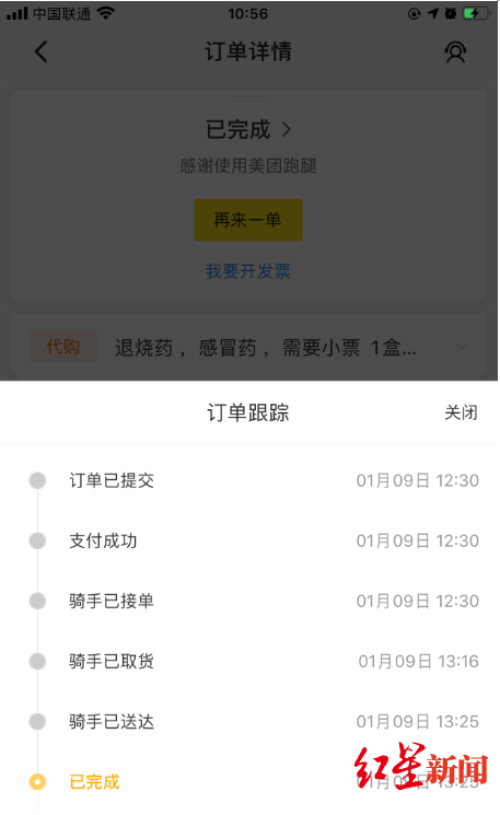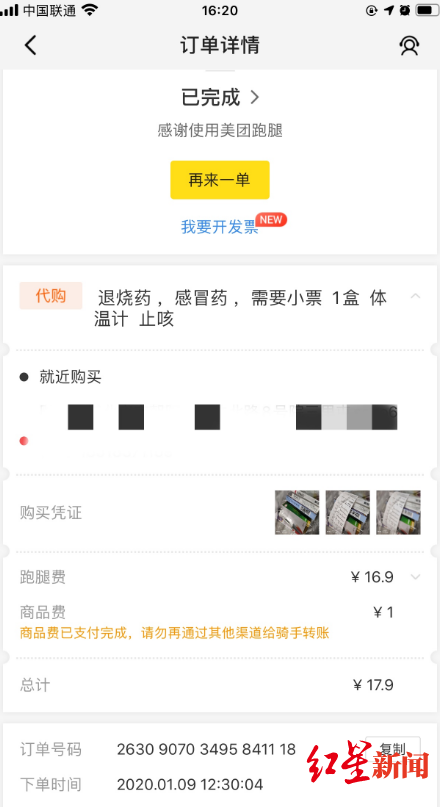 1月9日近中午白女士开始发烧,嗓子疼痛,于是她通过美团APP选择了跑腿代购购买药物。红星新闻记者看到,通过该平台“跑腿代购”选项进入,在“同城帮买”的页面里,有专门的“代购药物”页面。根据白女士提供的当时的订单截图显示,白女士备注需要代购的内容为“退烧药、感冒药一盒、体温计、止咳”并备注“需要小票”、“就近购买”。