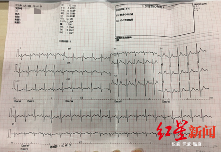 白女士回忆,14:40左右,自己明显感觉身体不适,于是请假至附近的朝阳医院心内科就诊,检测结果显示心率为127次/分,根据白女士提供的当时的心电图,红星新闻记者看到,上面注明“异常的心电图”:极度心动过速、右心电轴偏转。在此期间,这名骑手给白女士发来了药物真实的购买信息,上面显示共计35元。