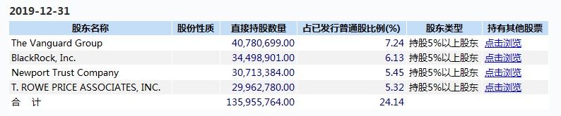 截止2019年末,持股超过5%的股东有:先锋基金(7.24%),贝莱德(6.13%),Newport Trust Co.(5.45%),T. ROWE PRICE ASSOCIATES(5.32%)。