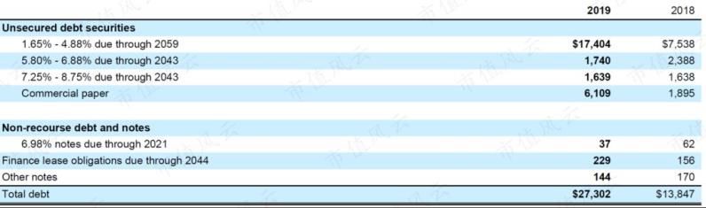 2019年,波音收入为766亿美元,同比下跌24%。自由现金流为-43亿美元,所以公司密集发行无抵押债券,截止2019年末,有息负债273亿美元,上年同期为138亿美元。资产负债率为106%,名义上的“资不抵债”。