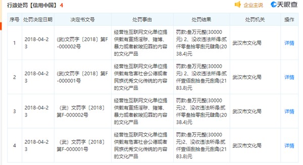 值得注意的是,根据天眼查,斗鱼还曾被武汉市文化局多次处罚。处罚原因有斗鱼提供载有宣扬淫秽、赌博、暴力或者教唆犯罪的内容的文化产品、提供载有危害社会公德或者民族优秀文化传统的内容的文化产品、提供载有宣扬淫秽、赌博、暴力或者教唆犯罪的内容的文化产品等。