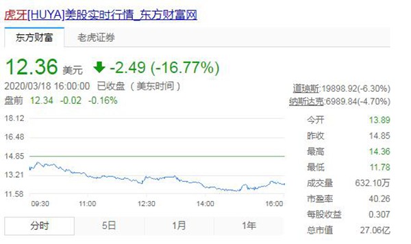 而3月19日,虎牙股价继续暴跌。截至美国东部时间3月18日收盘,虎牙股价已经跌至12.36元。市值仅剩27.06亿元。
